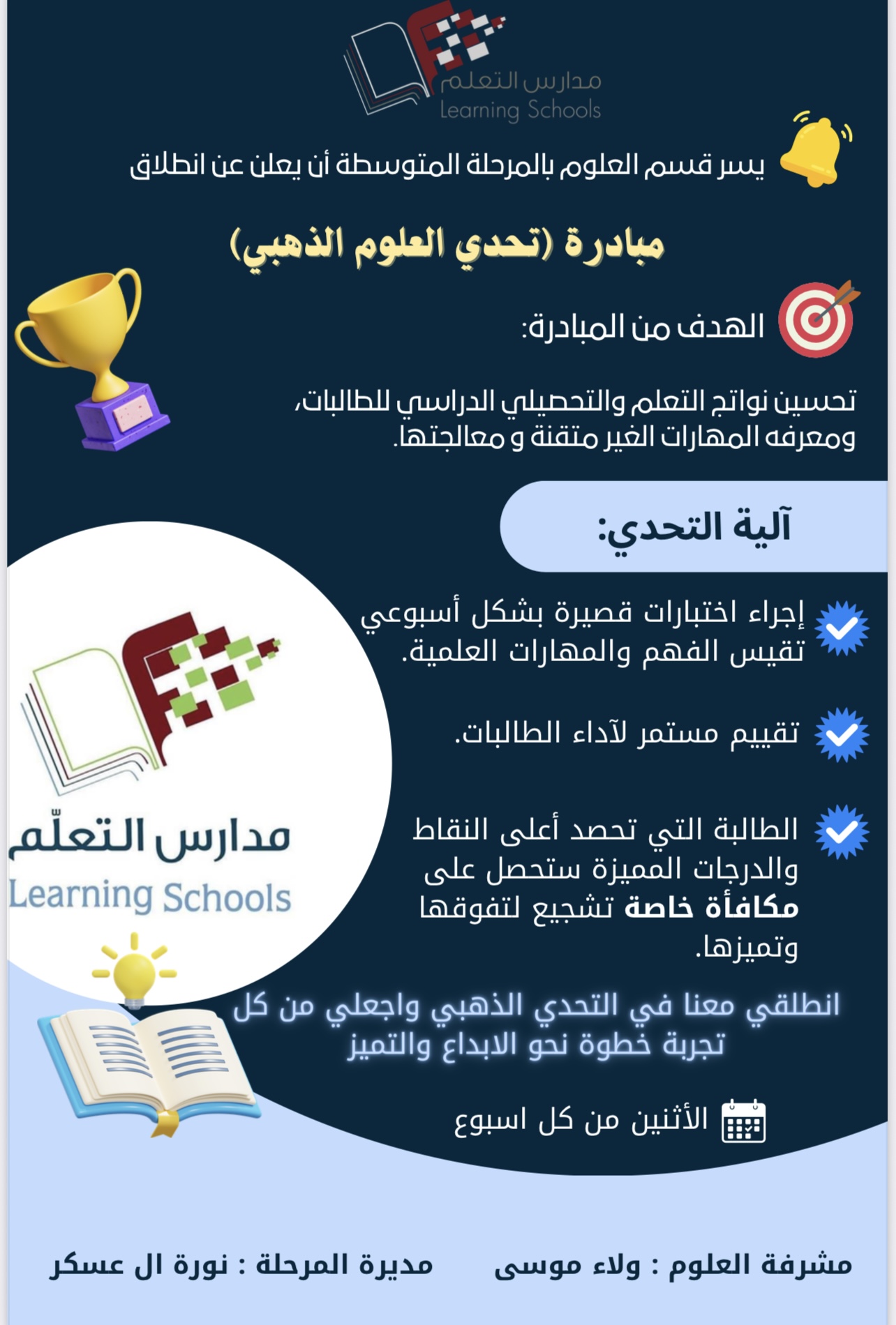 رسالتنا : تقديم تعليم وتعلم نوعي،مبني على المخرجات، يعزز القيم وينمي الموهبة، لبناء طالب قادر على التعلم مدى الحياة، و المنافسة عالمياً، في بيئة تربوية جاذبة وآمنة ومواكبة لمتطلبات العصر وتقنياته، على يد كفاءات متخصصة، في ظل شراكة أسرية ومجتمعية داعمة،ووفق أعلى معايير الجودة